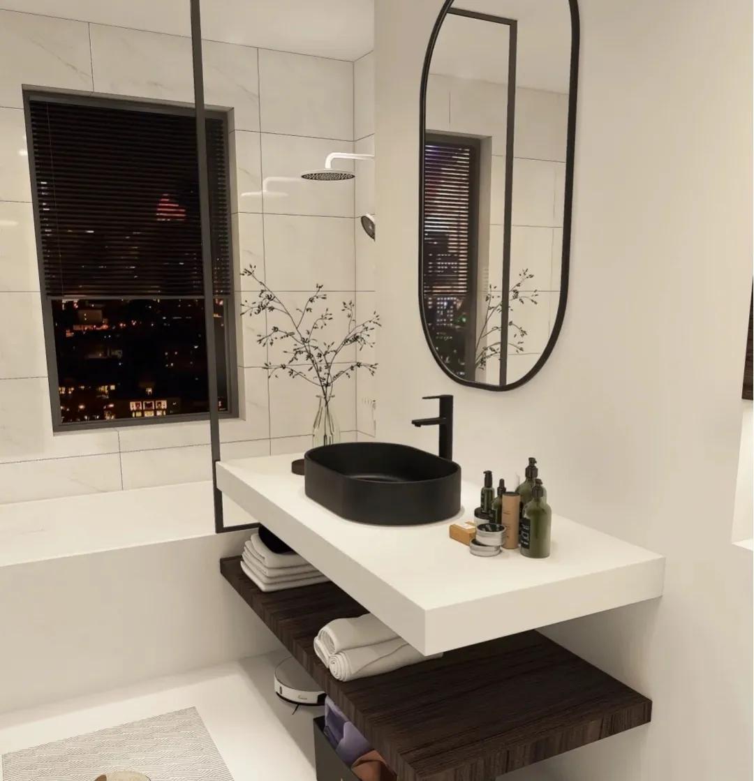 对于卫生间来说,深色系的底色是必不可少的元素。