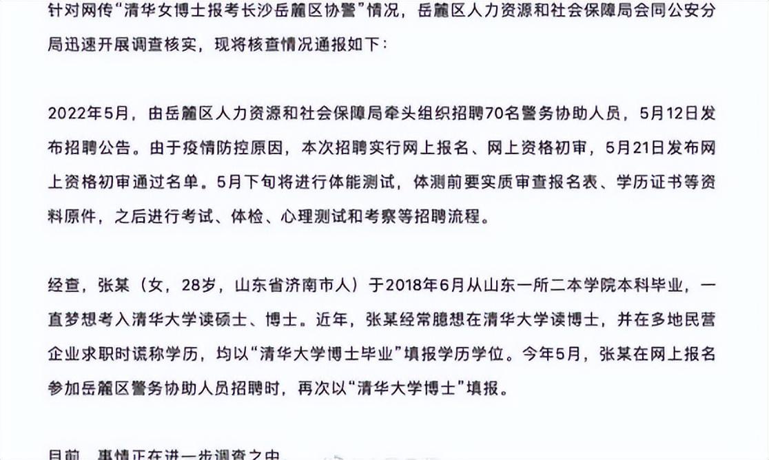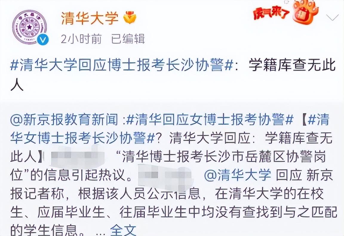 本以为事情就此结束,没想清华大学给出重磅回应。清华大学看到网络上的消息,立即核实女博士身份,结果发现学籍库查无此人。这个回应证明给女博士系谎报学历,她根本不是清华大学学生,不管是在校生、应届生还是往届生都没有查到这名学生信息。清华大学这次也是无辜躺枪。