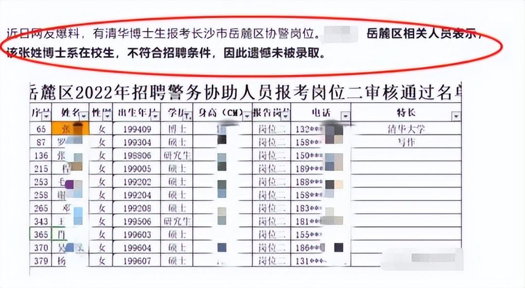 从曝光的名单中可以看到,她的学历是最高的,其他学生都是研究生学历。这件事引来众多网友关注,不知道这位女博士是怎么想的,既然毕业于清华,那应该不愁找工作,何故连个协警都应不上,还有不少网友质疑清华博士生的质量,认为空有“学历光环”,没有能力也一样连“普通”工作也找不到。