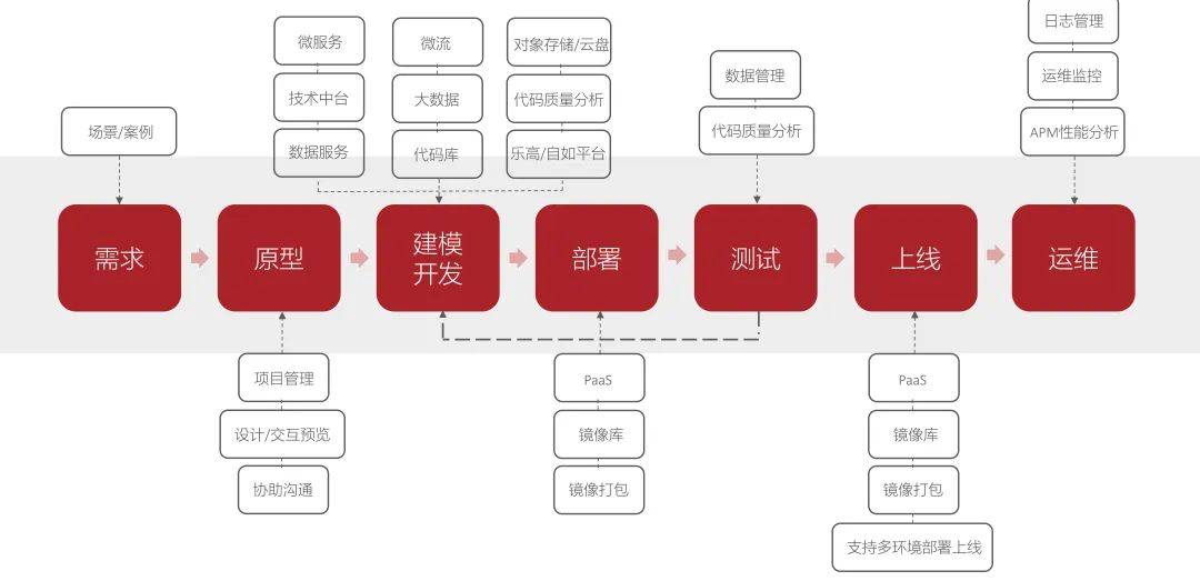提供整个开发全过程各环节工具,包括原型、建模开发、测试部署、发布流水线、运维监测等。