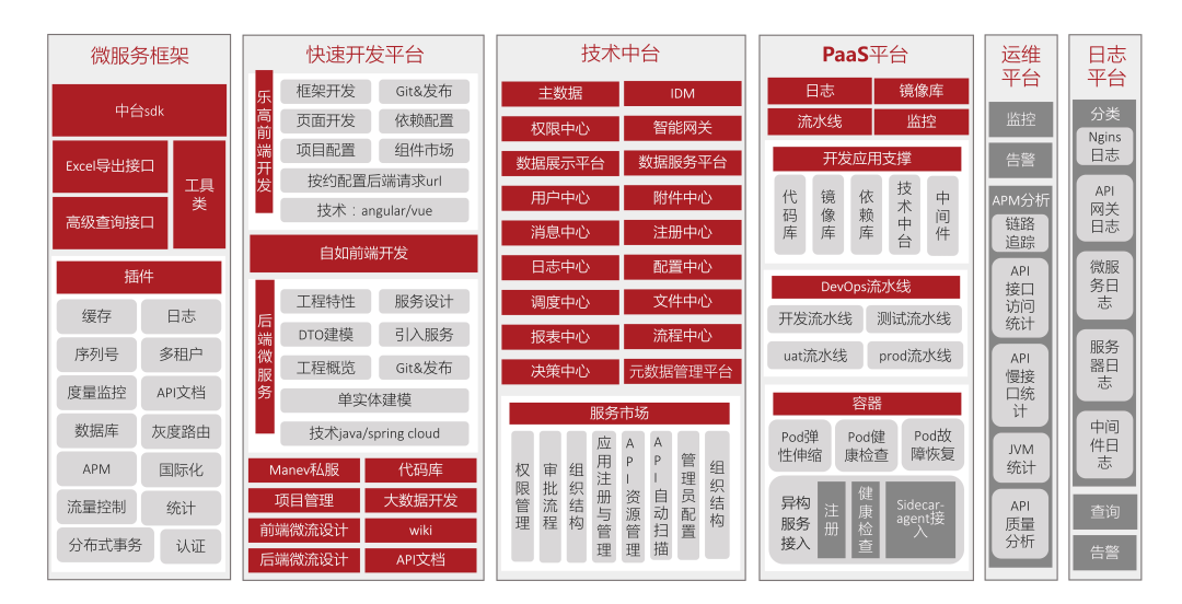 平台拥有松耦和合高内聚的微服务架构,低代码开发平台+服务中台+运维监控+数据治理+大数据平台+ DevOps+PaaS平台+容器和测试平台+专属服务。