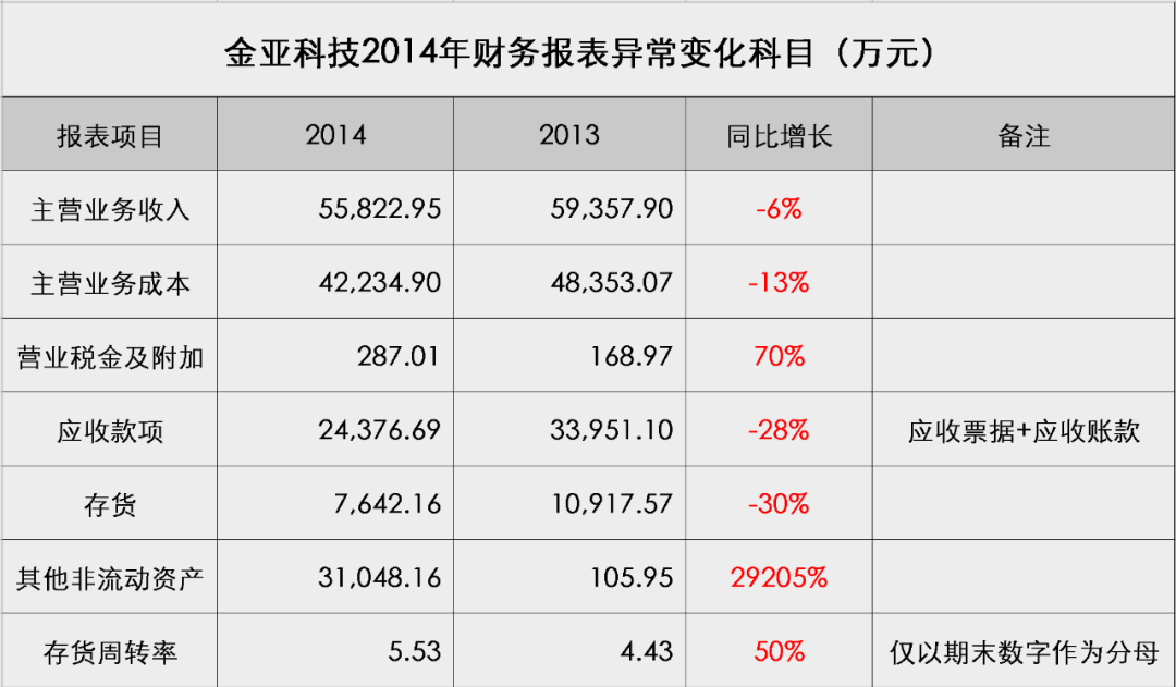 另外,在分析程序上,金亚科技除了利润扭亏为盈外,报表的其他科目也发生了一些异常的变化: