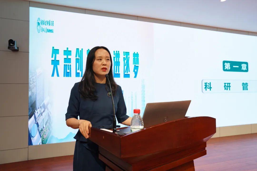 科研外事教学办公室主任许林平讲解科研项目管理、论文著作管理、成果管理等相关奖励规定,博士启动基金及苗圃基金规定,职工到荷美尔研究院学习、参加学术会议管理、继续医学教学管理等规定,研究生导师招生资格认定,科研诚信及保密制度。