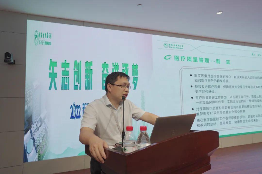 医务部主任李祥进行医疗质量管理培训。结合实际工作案例,讲解医疗质量管理定义、OMC科学管理思维概述、医务部的总目标和职能、部室战略地图(目标)、把好要素准入关、医疗质量安全核心制度、风险管控等。