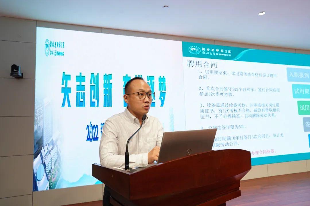 人力资源部副主任陈镜,副主任黄晓宁,田龙,王凯枫分别向新职工介绍医院概况、人事管理制度、职业行为规范、职业晋升通道等,使新职工尽快熟悉、了解医院核心价值观,培养良好职业道德规范,及早规划,成长成才。