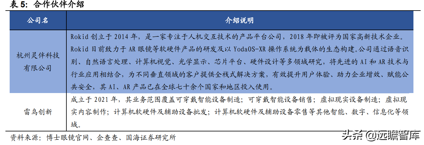 2022 年 5 月,公司和雷鸟创新成立联合实验室,依托双方既有的研发团队,围绕人体佩戴工学、光波导 AR 眼镜的近视解决方案进行研发攻关,探索近视镜与光波导 AR 眼镜的最佳融合方案。围绕“舒适的科技”在智能眼镜产品上再发力。
