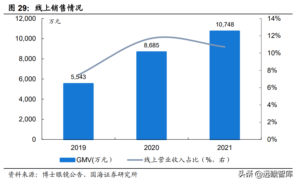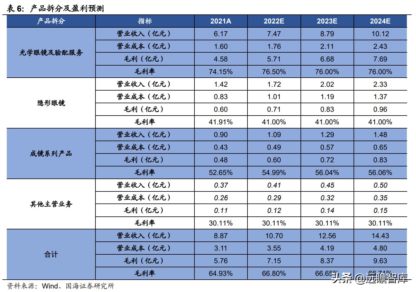 中高端消费产品销售占比增加有望驱动客单价提升。目前,公司销售的品牌基本已覆盖了所有奢侈品服饰品牌的眼镜品类。2021 年,公司持续优化产品品类结构和渠道,中高端产品占比提升,中高端产品单价高,带来业绩增长。