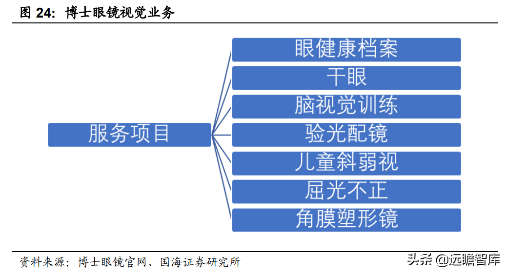 公司产品包 括光学眼镜及验配服务(镜架、镜片和验配服务)、成镜系列产品(太阳镜、老花镜等)、隐形眼镜系列产品(软、硬性隐形眼镜、护理液)及眼健康周边产品,通过遍布全国的门店销售网络为消费者提供时尚化、个性化的眼镜产品和专业的视觉健康解决方案。此外,公司与山姆、免税店等渠道联营打造配镜中心,并与医院合作开设视光中心。