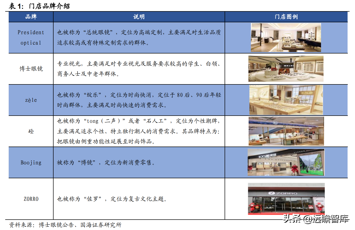 公司积极打造自有门店品牌进行多层次市场布局,目前公司拥有六大眼镜零售品牌,并不断丰富品牌内涵,提升品牌效益。四大主打品牌包括“Presidentoptical”、“博士眼镜”、“zèle”、 和“砼”。同时,公司新发展了“ZORRO”品牌以及“Boojing”品牌。