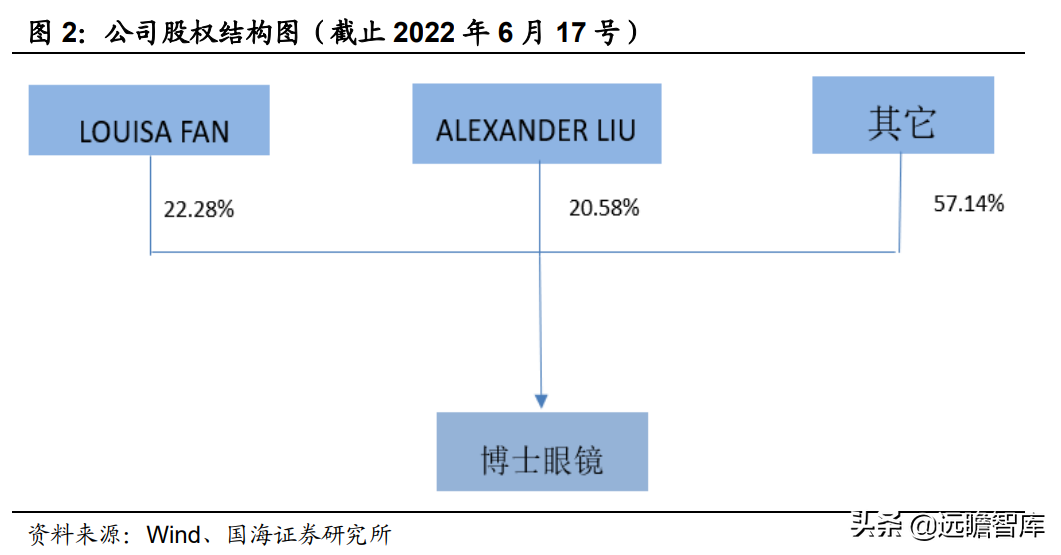 公司控股股东为 LOUISA FAN 女士,持股比例 22.28%,现任博士眼镜连锁股份有限公司董事,总经理;第二大股东为 ALEXANDER LIU 先生,持股为 20.58%,现任博士眼镜连锁股份有限公司董事长。ALEXANDER LIU 女士和 LOUISA FAN 先生系夫妻关系,合计持股占比为 42.86%。公司主要子公司分布全国各省,主要开展眼镜销售业务。