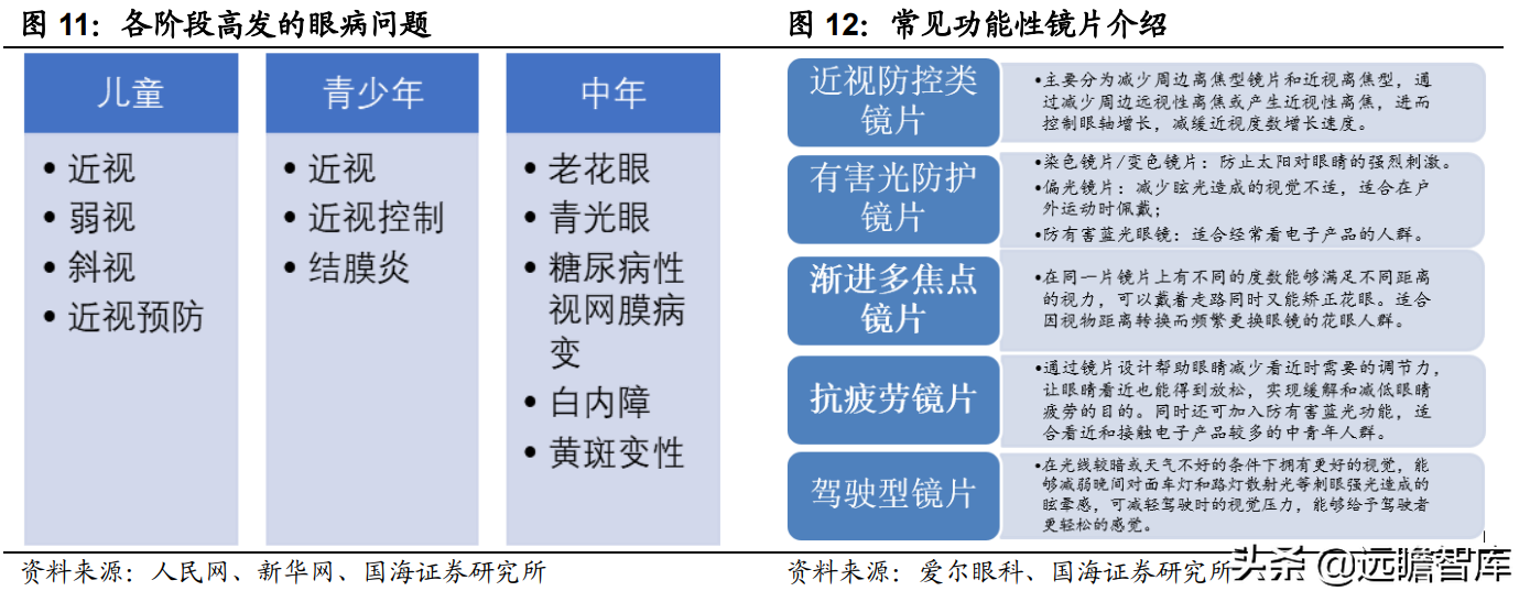 不同年龄人群面临不同视力问题的威胁,多功能、多品类的眼镜需求呈上升趋势。信息化时代下电子产品在生活中全方位的渗透使得近视低龄化问题突显,同时随着人口结构老龄化的不断加深与年龄相关的中老年人视力缺陷持续增加,视力问题人口基数呈逐步扩大趋势。与此同时,针对不同的视力问题衍生出了多种功能性的镜片需求,在整体受众规模较为庞大的背景下,我国的眼镜市场具有较大发展潜力。