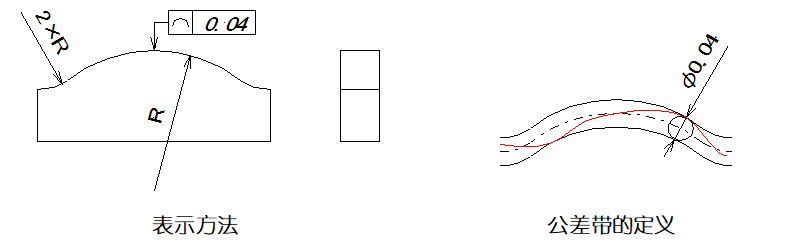 ▲图样示例:公差带是由包络一系列直径为公差0.04mm的圆的两包络线之间的区域。诸圆的圆心位于具有理论正确几何形状的线上。