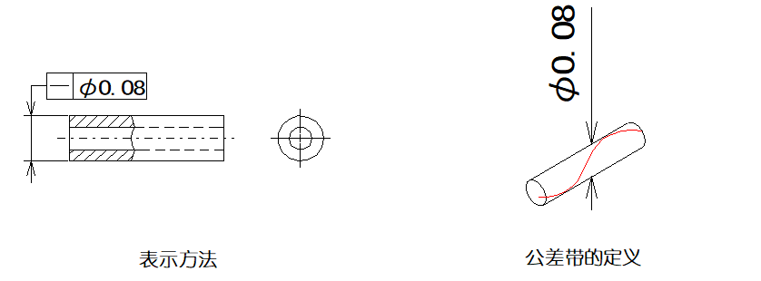 ▲图样示例2:在公差值前加注记号φ、则公差带必须在直径0.08mm的圆柱面内的区域。