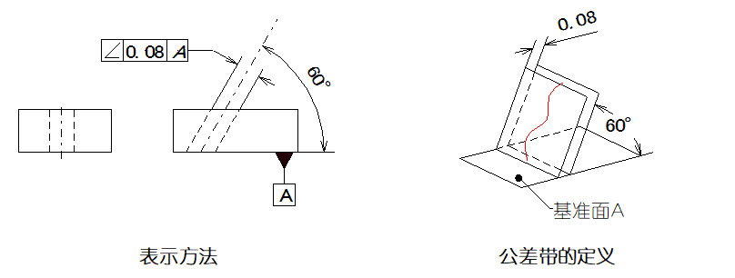 ▲图例说明:被测轴线的公差带是距离为公差值0.08mm,且与基准面A成理论角度60°的两平行平面之间的区域。