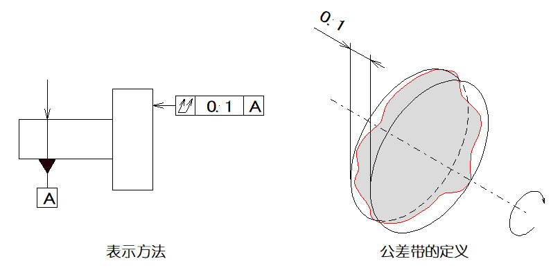 ▲图例说明1:公差带是距离为半径差0.1mm,且与基准同轴的两圆柱面之间的区域。