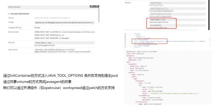 Java 生态免修改注入 agent 方式-JAVA_TOOL_OPTIONS同时,我们也借鉴了 ARMS 免修改注入 Agent 的方式。ARMS 通过one point initContainer 的方式注入了很多 ARMS 信息,也挂载了一个名为 home/admin/.opt 的 mount 用于存储日志。正因为有 initContainer ,它才能够实现自动升级。