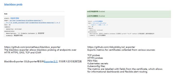 Prometheus Exporter除了 ARMS 等商业化产品外,我们也积极开源,拥抱 Prometheus 社区,接入了较多 Exporter 组件,包括 SSLExport 和 BlackBoxExporter,极大提升了整个系统的可观测性。Exporter 可以用于黑盒探针,比如探测 HTTP 请求是否正常、HTTPS 请求是否正、DNS 是否正常、TCP 是否正常等,典型的使用场景是探测当前服务入口地址是否正常。SSL 证书异常更为常见,通过 SSLExporter 可以定期轮询证书是否过期,进一步提升可观测性。