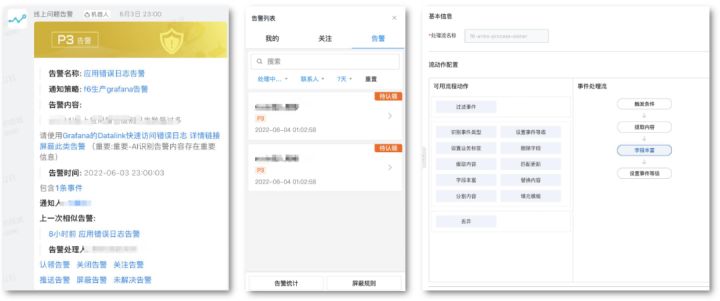 上图为线上处理问题的界面截图。比如钉钉群里的告警会提示上一次相似告警由谁处理、告警列表以及对应事件处理流程等。同时,还提供了过滤功能,可以分割内容,通过字段丰富或匹配更新等方式替换内容填充模板,用于精准告警,比如识别到应用名称后,可以关联到对应应用的 owner 或告警人员。此功能后续也将逐步替代前文用 Go 语言写的 Apollo SDK 应用。