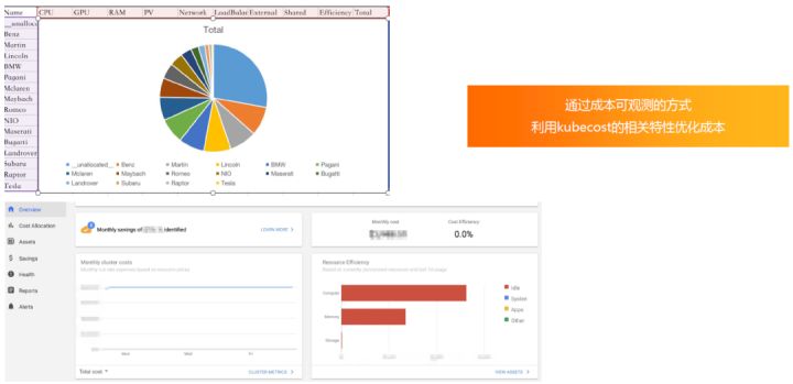 成本观测除了日常服务可观测,我们还实践了成本可观测等优化项目。对于云原生环境,可以利用 kubecost 开源组件进行成本优化,直接输出资源使用率以及报表等,反馈给研发人员进行优化,甚至可以用来发现 CPU 和内存是否呈正常比例,尽可能实现资源合理分配。