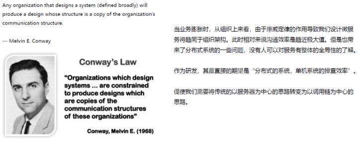 虽然微服务和组织架构趋同使得系统沟通效率较高,但是这也带来了很多分布式的系统问题。比如微服务之间的交互,没有人能够对服务有整体性、全局性的了解,研发人员最直接的期望就是在分布式系统中也能有单机系统的排查效率,这促使我们需要将系统以服务器为中心的思路转变为以调用链为中心的思路。