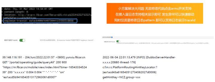ARMS 支持 traceId 透出 responseHeaderF6 公司和 ARMS 团队也进行了深入合作,探索了可观测的最佳实践。ARMS 近期退出了一项新功能,将 traceID 直接透出到 HTTP 头,可以在接入层日志中将它输出到对应日志,通过 Kibana 进行检索。