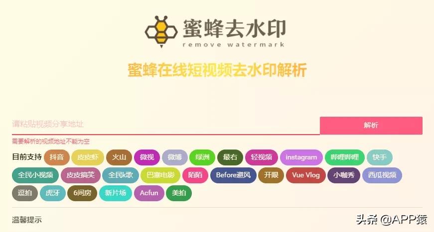 【蜜蜂去水印】是主流短视频应用的去水印工具,直接把对应视频链接复制黏贴到输入框中解析即可提取无水印版本的视频。