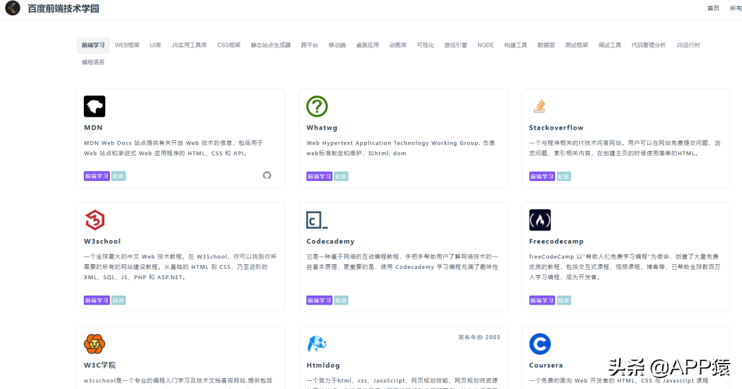 【百度前端技术学园】是百度出品的一个专业前端学习站点,完全免费,内容涉及各种前端知识包括HTML 、CSS 、JAVASCRIPT等,除了语法学习还有各种详细的案例,题目。对于正在学习前端开发知识的用户值得收藏。