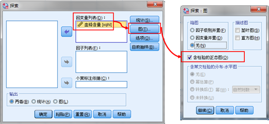 如果我们需要检验不同组别样本正态性,可在“探索”对话框中将分组变量选入“因子列表”,可分别检验 不同组别样本上的 正态性。