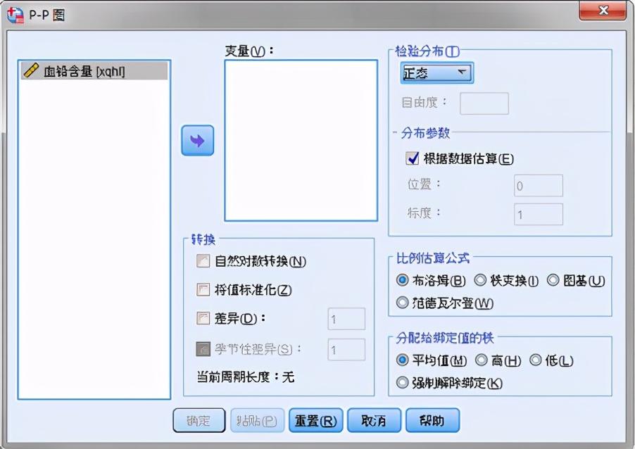 变量:需分析的变量,可选择多个或一个检验分布:检验分布类型,默认是正态分布,在下拉列表中可供选择类型包括β分布、χ2分布、指数分布、拉普拉斯分布、Logistic分布、对数正态分布、帕累托分布等分布参数:定义所检验的分布参数,默认是“根据数据估算”,即根据样本数据估计总体参数。转换:对原始数据进行一定的变换后再进行相应的分布检验,默认是不进行任何变换。可供选择变化:自然对数变换、数值标准化、差分变化和季节差分变化。当选择差分和季节差分变换时,需填入差分变化的数值,季节性变化仅当数据为时间序列数据时可选。比例估算故事和分配给绑定的秩:较少选择,采取默认即可3. 结果输出与说明