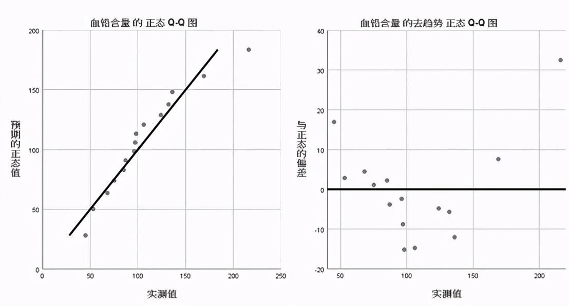 /DIST=NORMAL.Q-Q图原理与P-P图非常类似,也用于比较变量的实际分布与其所假定的理论分布是否一致。但P-P图比较的是两者的累计概率分布,而Q-Q图则是根据变量的实际百分位数与理论的百分位数进行绘制的,相比之下,Q-Q的适用条件较宽松,结果也更稳健。