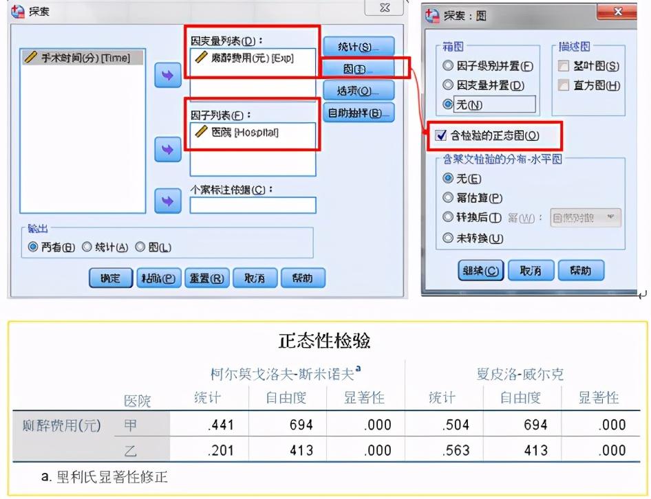 示例:判断不同医院在麻醉费用上的分布是否呈正态性?