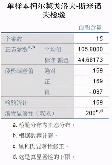 由下表可知,K -S 检验=0.169,P =0.200 > 0.05,血铅含量符合正态分布。