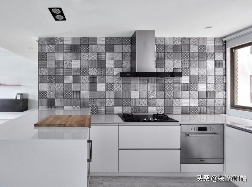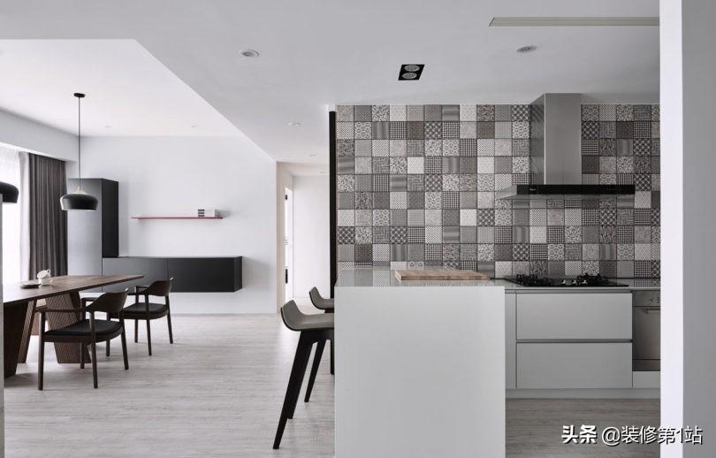 开放式的厨房,利用U字型的结构,满足了烹饪与休憩的需求,再在一侧配置2张高脚凳,便是一个小吧台。厨房墙面则铺贴混色的小花砖,打破纯色沉闷的观感,也彰显着屋主的小心思。