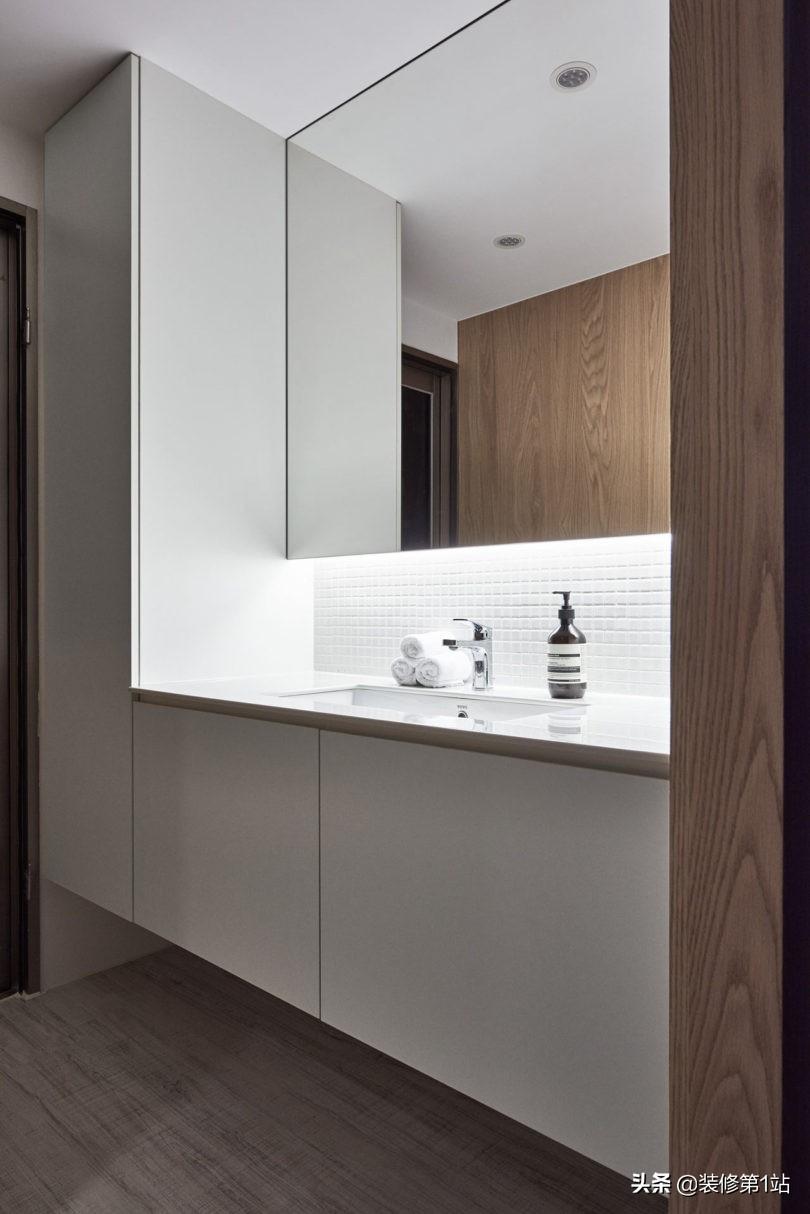 延续全屋的装修风格,白色与原木色结合,镜子下方安装灯具,避免了阴影遮挡的不便,方便整理,同时给人简约而精致的感受。