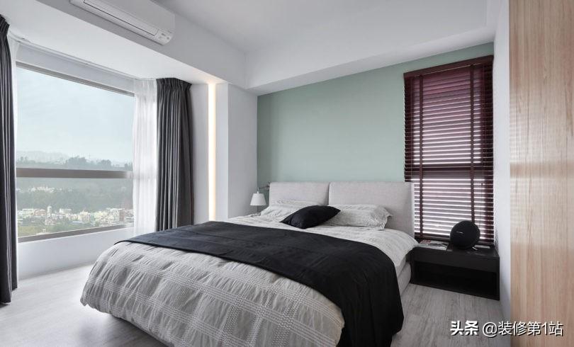 唯一的颜色变换,出现在卧室,床头背面刷上淡淡的蛋壳绿,清新典雅。窗体正面对床,光线充足,每天起床时,拉开纱帘,尽享一览无遗的自然风光。