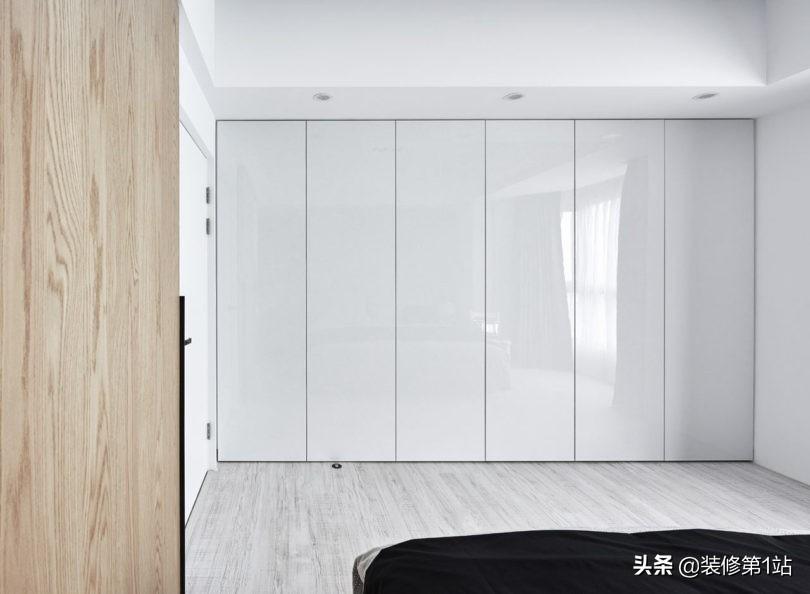 床尾的联排柜,可以容纳主人家的所有美丽衣裳,白色的柜门,令空间更加明亮宽敞。