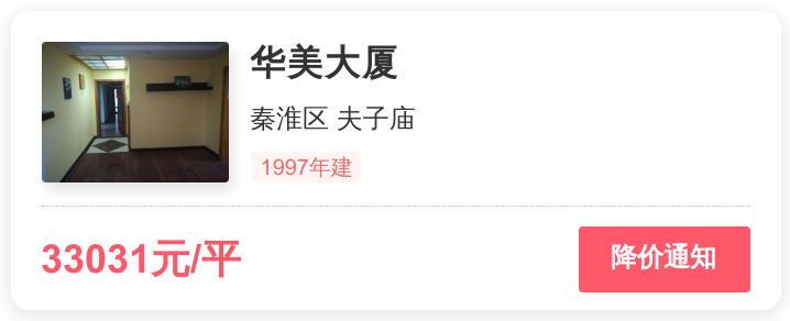 龙翔隐园(建筑年代:2017;均价:50517.1元/㎡) 中华路278号小区(建筑年代:2017;均价:28109.0元/㎡) 斯亚财富中心(建筑年代:2017;均价:36575.0元/㎡) 钞库街(建筑年代:2017;均价:46064.2元/㎡) 夫子庙金街(建筑年代:2015;均价:60527.0元/㎡)以上即为幸福里对华美大厦的测评内容,小区具体信息请以实际情况为准,欢迎下载幸福里app看房选房。