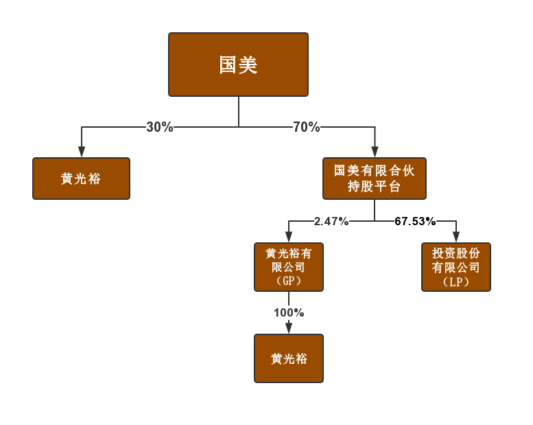 将投资人和激励员工的股权都放在国美有限合伙持股平台,黄光裕有限公司作为GP,由黄光裕100%控股。投资股份有限公司作为LP,股东为激励员工和投资人。