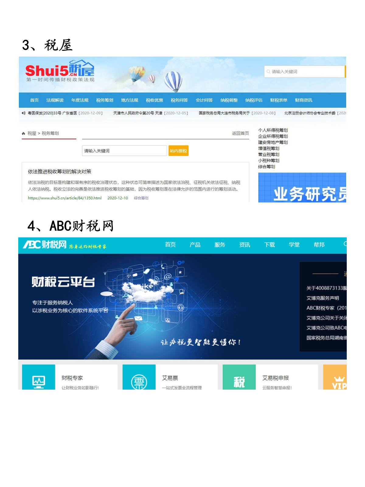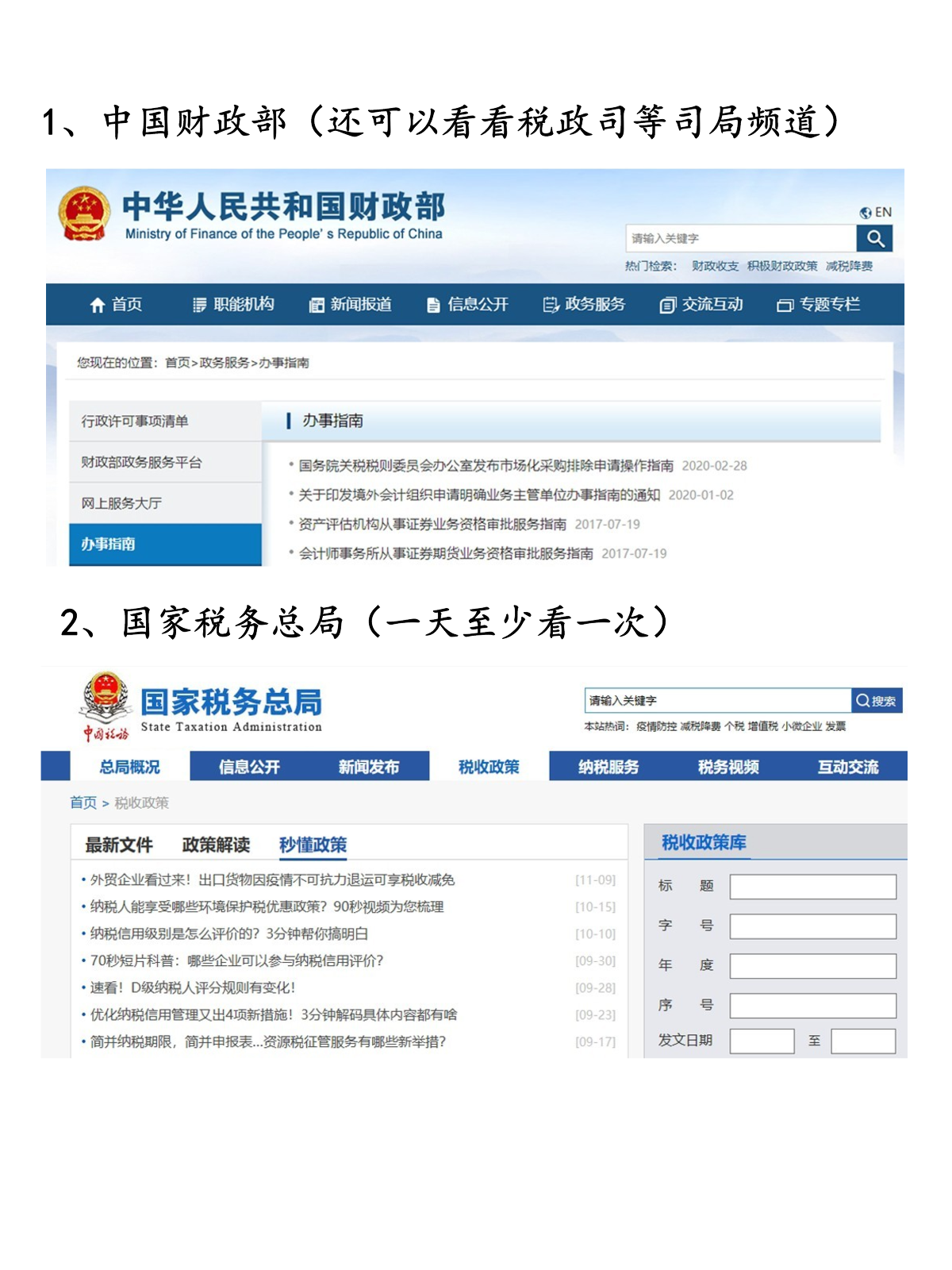 1、财政部 http://www.mof.gov.cn/index.htm2、国家税务总局 http://www.chinatax.gov.cn/3、税屋网 http://www.shui5.cn4、ABC财税网 http://www.abc12366.com5、国家企业信用信息公示系统 http://www.gsxt.gov.cn/index.html6、12366纳税服务平台。 http://12366.chinatax.gov.cn/