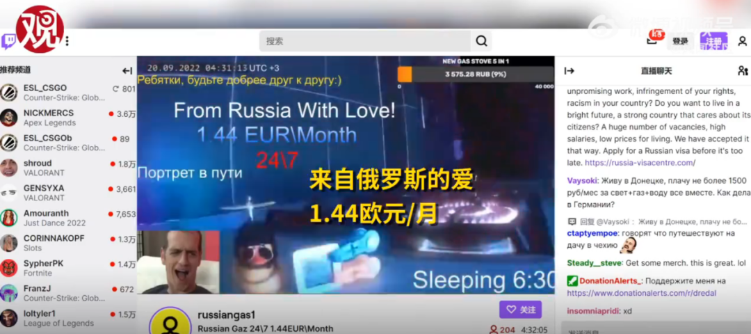 5、俄网友24小时直播灶台燃火 目前,欧洲各国都在努力限制能源使用。在此背景下,近日,一名俄罗斯主播引发热议,他将镜头对准一个点了火的灶台,进行24*7的全时段直播。他在直播画面中写道“来自俄罗斯的爱”,在介绍中称“俄罗斯人每月只需要花费1.44欧元燃气费。”(@观察者网)