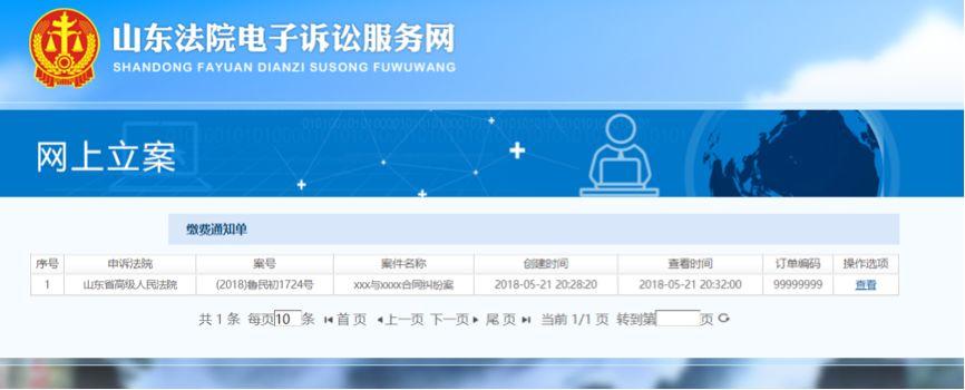 点击顶部菜单缴费通知按钮,进入缴费通知单列表页面。列表页面展示当前登录人相关的缴费通知单,包括申诉法院、案号、案件名称、订单编码等信息。页面的操作只有查看。点击查看按钮即可查看申诉法院下发的PDF版诉讼费缴纳通知书。
