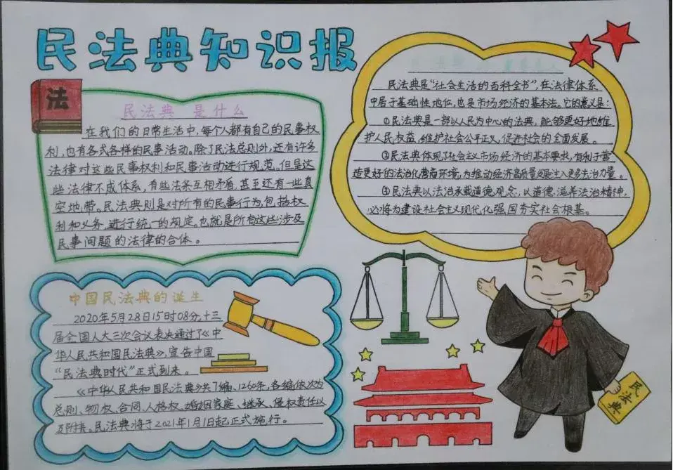 经过消化学习,课后老师组织三个班级学生制作了《民法典》手抄报,择优选出18份《民法典》手抄报,将法治宣传和手抄报相结合,将《民法典》的元素融入手抄报中,体现《民法典》的内涵、特征及意义等内容。本次活动寓教于乐,受到学生和家长一致好评。