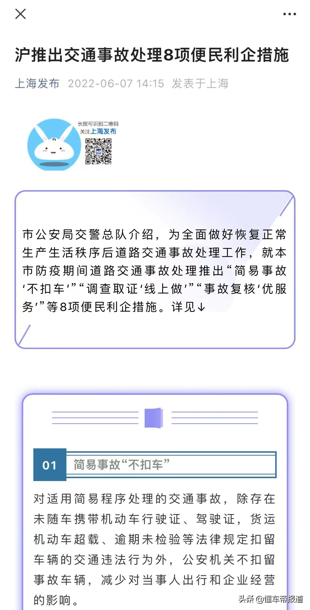 [懂车帝原创 行业] 据“上海发布”公众号消息,上海市公安局交警总队日前介绍,为全面做好恢复正常生产生活秩序后道路交通事故处理工作,就本市防疫期间道路交通事故处理推出“简易事故不扣车”、“调查取证线上做”、“事故复核优服务”等8项便民利企措施。