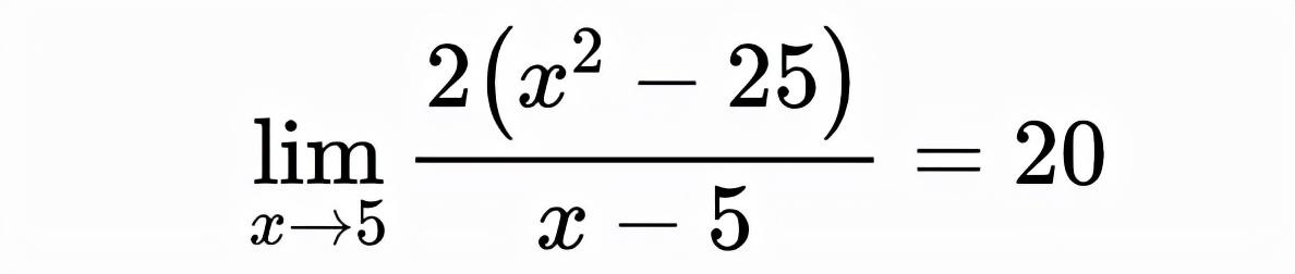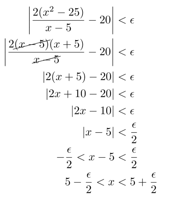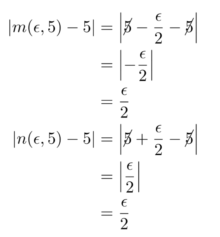 m(ϵ, 5) = 5 - ϵ / 2,n(ϵ, 5) = 5 + ϵ / 2。请注意,如果我们想从分子和分母中取消(x - 5),x不能等于5。幸运的是,对于极限来说,x永远不需要。现在,我们计算上面的两个值,需要确定一个的值。