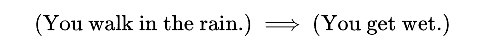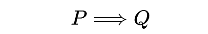 这个表达式意味着,如果P是真的,那么Q就是真的。典型的例子是 "如果你在雨中行走,那么你会被淋湿",这句话看起来像: