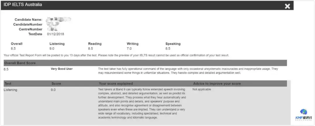 大家好,我是考满分的学员川筱荼兒Kimmy。我在美国上了四年本科,学习商科和音乐双专业,毕业后在美国波士顿工作,现在在四大会计事务所之一做咨询。因为有移民英联邦国家的想法,所以我报考了多伦多2018年12月雅思G类的考试。这是我第一次接触雅思,由于平时工作比较忙,我又不想在考雅思上花费太多不必要的时间,所以2018年9月报了KMF考满分全部四门的课程。最后和雅思成功分手,拿到了总分8.5分的成绩,其中听力9,阅读8.5, 口语8.5, 写作8.5。