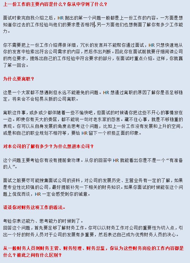 看到这么多人在害怕面试这个问题,就给我们公司的资深HR说了一嘴,她立马给了我一份财务会计人员的面试问题指南及回答技巧(附注意事项),他说面试的时候这样回答,offer收到你手软!!!