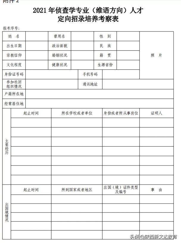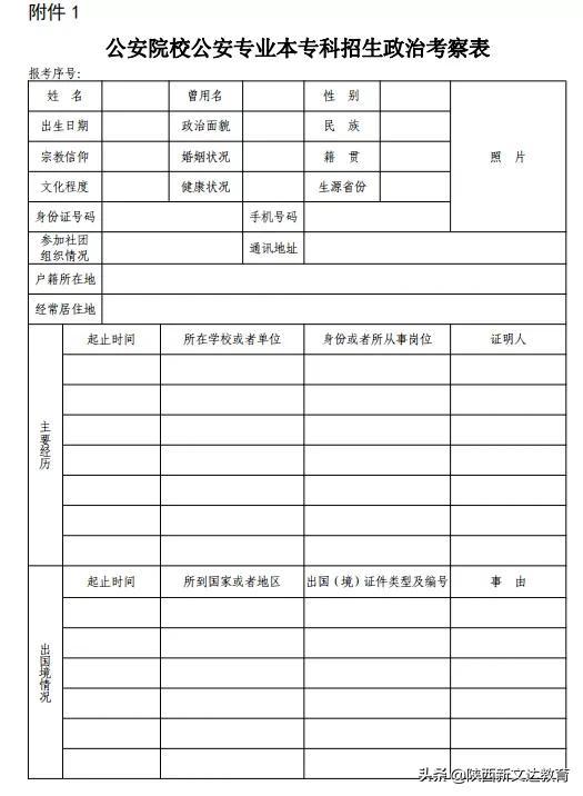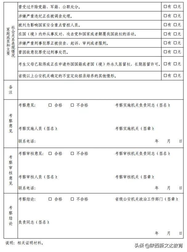 报考公安院校公安专业(新疆警察学院除外)的考生须自行下载打印《公安院校公安专业本专科招生政治考察表》(以下简称考察表,见附件1);报考新疆警察学院的考生须自行下载打印《2021年侦查学专业(维语方向)人才定向招录培养考察表》(附件2),两表必须用A4纸正反两面打印。表中基本情况部分及主要经历、出国境情况、受处分或者违法犯罪情况、家庭成员情况、主要社会关系情况由考生本人填写(不得涂改)。考生本人填写内容、考生表现情况、家庭成员和主要社会关系表现情况,由户籍所在地派出所通过网上核查、档案审核、走访调查、委托调查等方式开展考察工作,提出考察意见,签字并加盖公章,县级公安机关负责同志在政治考察实施机关负责同志处签字并加盖公章。市级公安机关政工部门在政治考察审核意见栏内,填写政治考察审核意见,签字并加盖公章。政治考察合格考生的考察表密封交考生本人,在面试时交省公安厅政治部。省公安厅政治部对考察情况进行分析,综合作出政治考察结论。各市、县(区)招办,各市、县(区)公安局(分局)和派出所,要高度重视报考公安院校公安专业考生的政治考察工作,认真负责,不得弄虚作假、不得推诿、不得向考生收取任何费用。