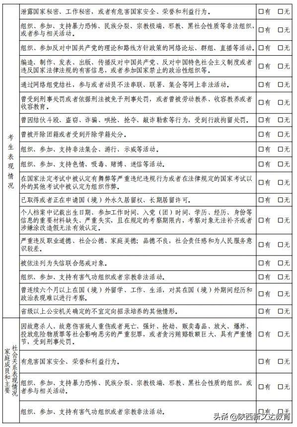 参加体能测试、体检和面试的考生须携带准考证、身份证、政治考察表、近期一寸彩照1张,今年的体能测试、体检及面试工作要严格落实疫情防控相关要求,考生还须携带参检前七日内由陕西省新冠病毒核酸检测指定医疗机构出具的核酸检测阴性证明,按规定程序参加体能测试、体检(不需空腹)及面试,逾期不予安排。