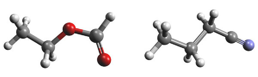 比如甲酸乙酯(左)和氰乙酸正丙酯(右)!在我们测量过的每一个分子云,原行星盘和恒星喷流中都有这些复杂的分子。因此,仅在我们的星系中出现智慧生命的几率非常高。